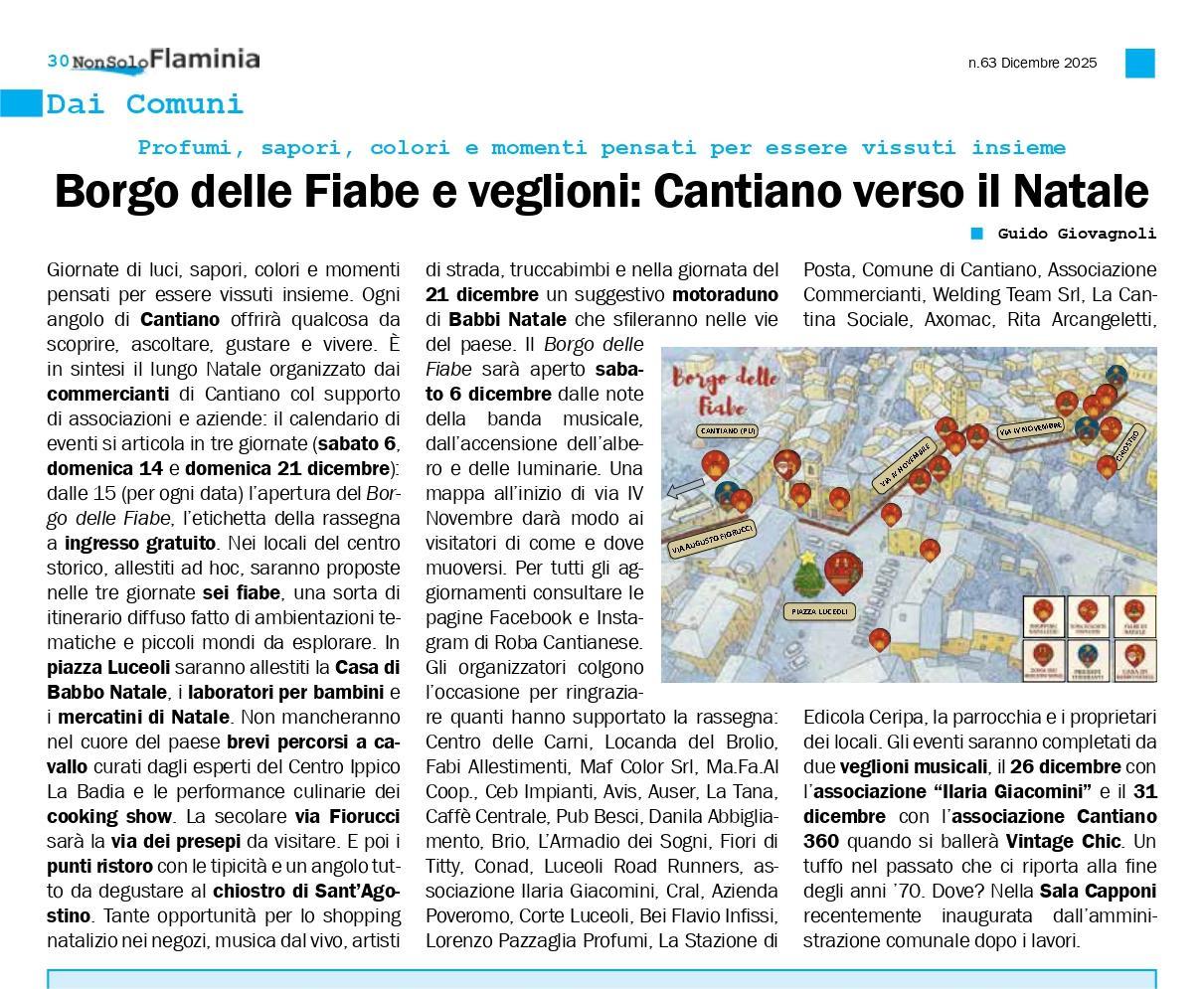 Il centro storico di Cantiano si trasforma nel "Borgo delle Fiabe" per tre pomeriggi di festa: sabato 6, domenica 14 e domenica 21 dicembre, dalle ore 15 in poi, con ingresso gratuito. Le vie del paese si animeranno con scenografie ispirate alle fiabe, la Casa di Babbo Natale in piazza Luceoli, laboratori per bambini, mercatini natalizi, spettacoli itineranti, truccabimbi, percorsi a cavallo, show cooking e una suggestiva sfilata dei Babbi Natale in moto per le vie del borgo.